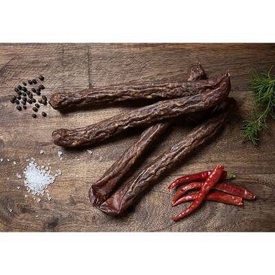 Würzige Rindsknacker mit Chilli über Buchenholz geräuchert.